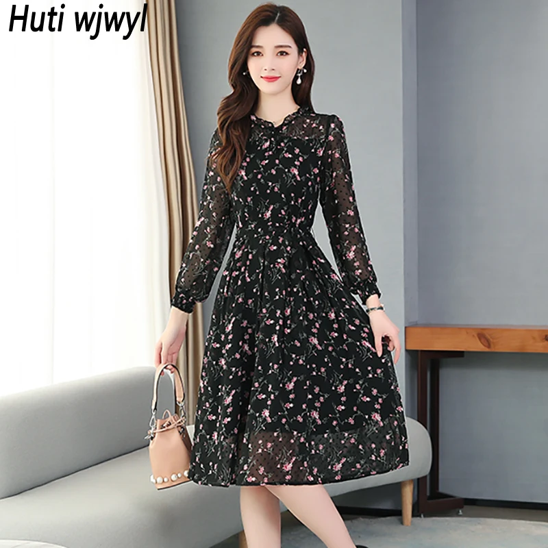 Женское винтажное шифоновое платье-миди с длинным рукавом и цветочным принтом