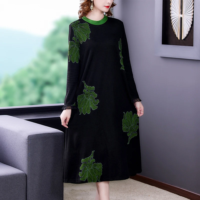 Женское вязаное бархатное платье, Элегантное повседневное винтажное зеленое платье с длинным рукавом и цветочным принтом, весна-осень 2022