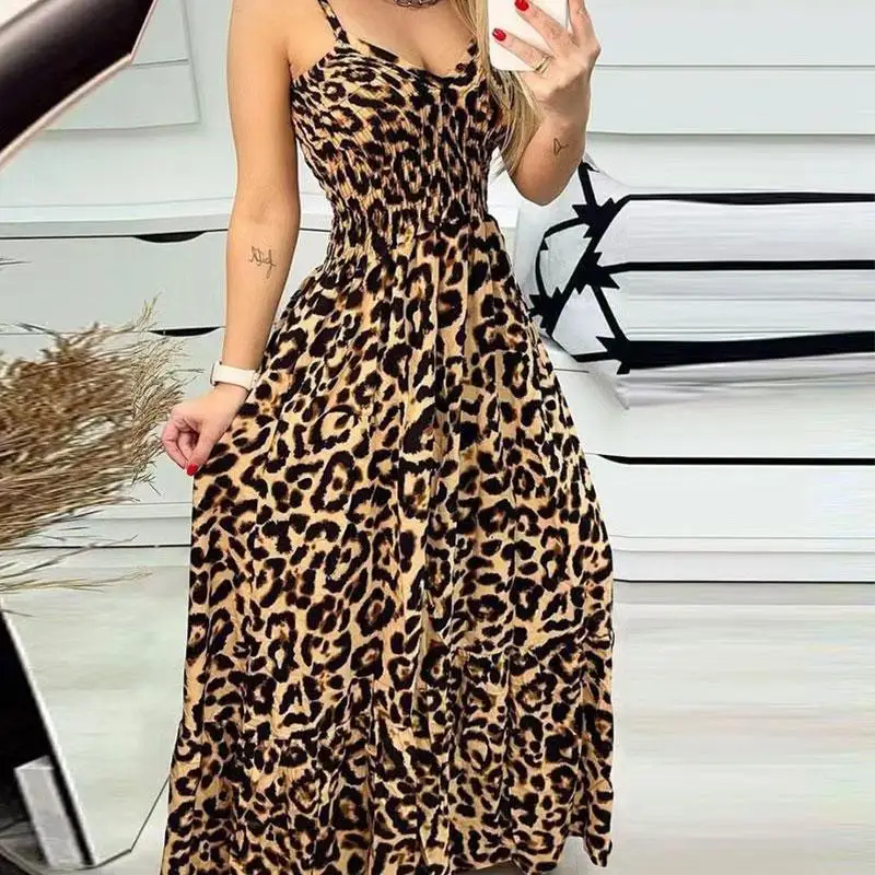 Женское вязаное крючком свободное леопардовое винтажное платье на бретельках с оборками большие летние элегантные женские платья