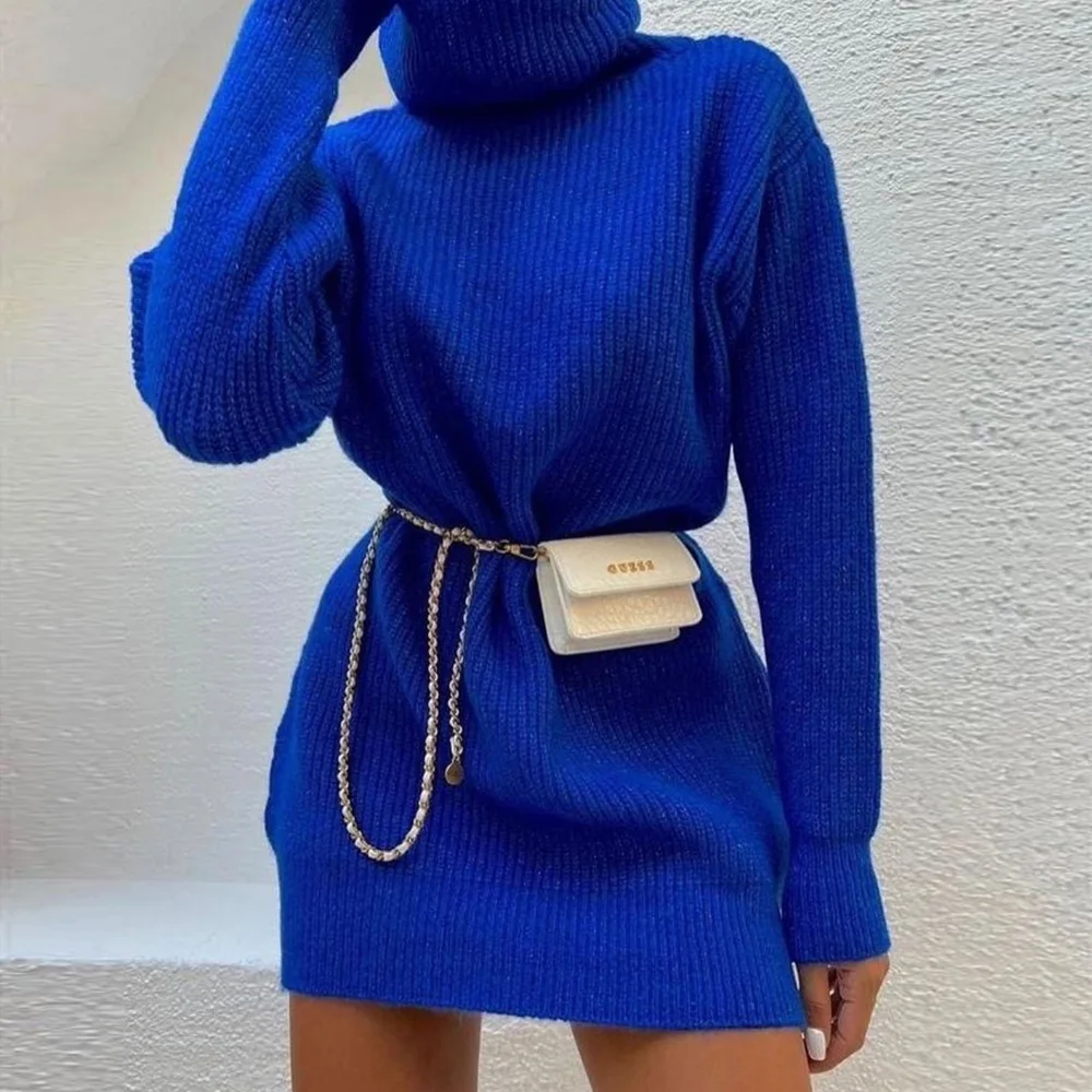 Женское вязаное платье-свитер с высоким воротником, с длинным рукавом