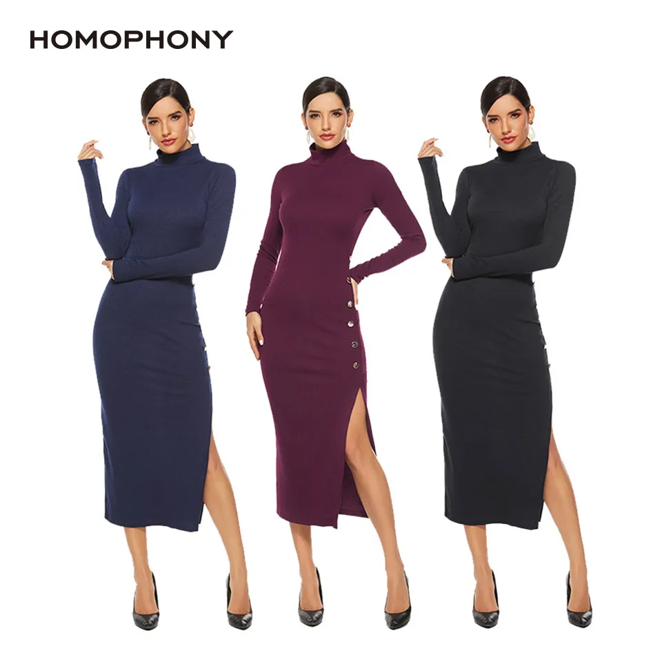 Женское вязаное платье-свитер HOMOPHONY, однотонные офисные обтягивающие платья-миди с высоким воротом, длинными рукавами и металлическими пуг...