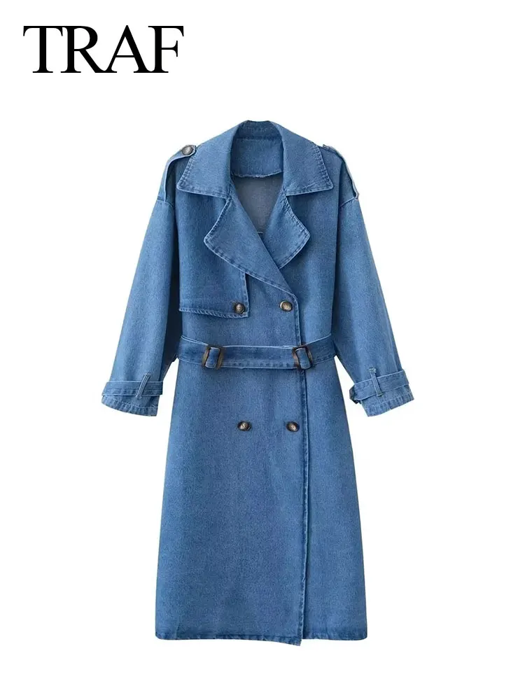Женское джинсовое платье-ветровка с поясом и длинным рукавом