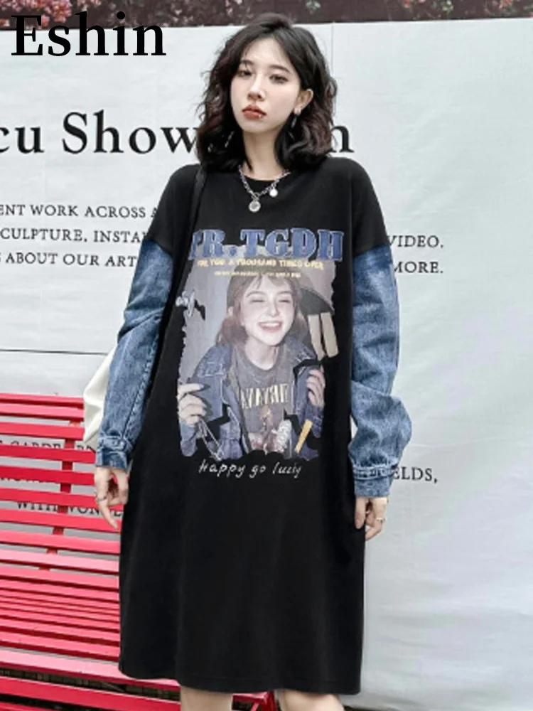 Женское джинсовое платье с длинным рукавом, круглым вырезом и принтом