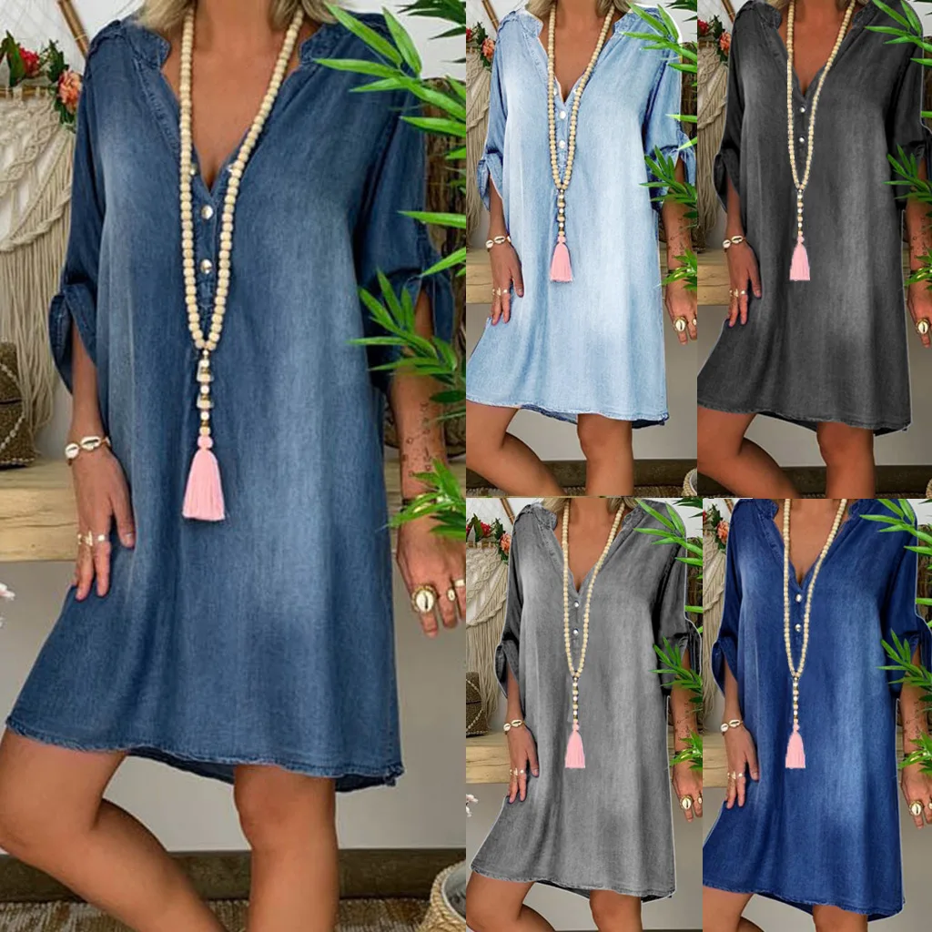 Женское джинсовое платье с коротким рукавом и V-образным вырезом