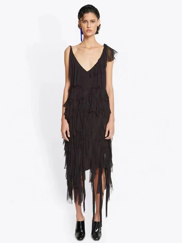 Женское дизайнерское платье с лямкой на шее, дизайнерское привлекательное асимметричное платье из смеси шелка и вискозы с оборками, несколько уровней, лето 2024
