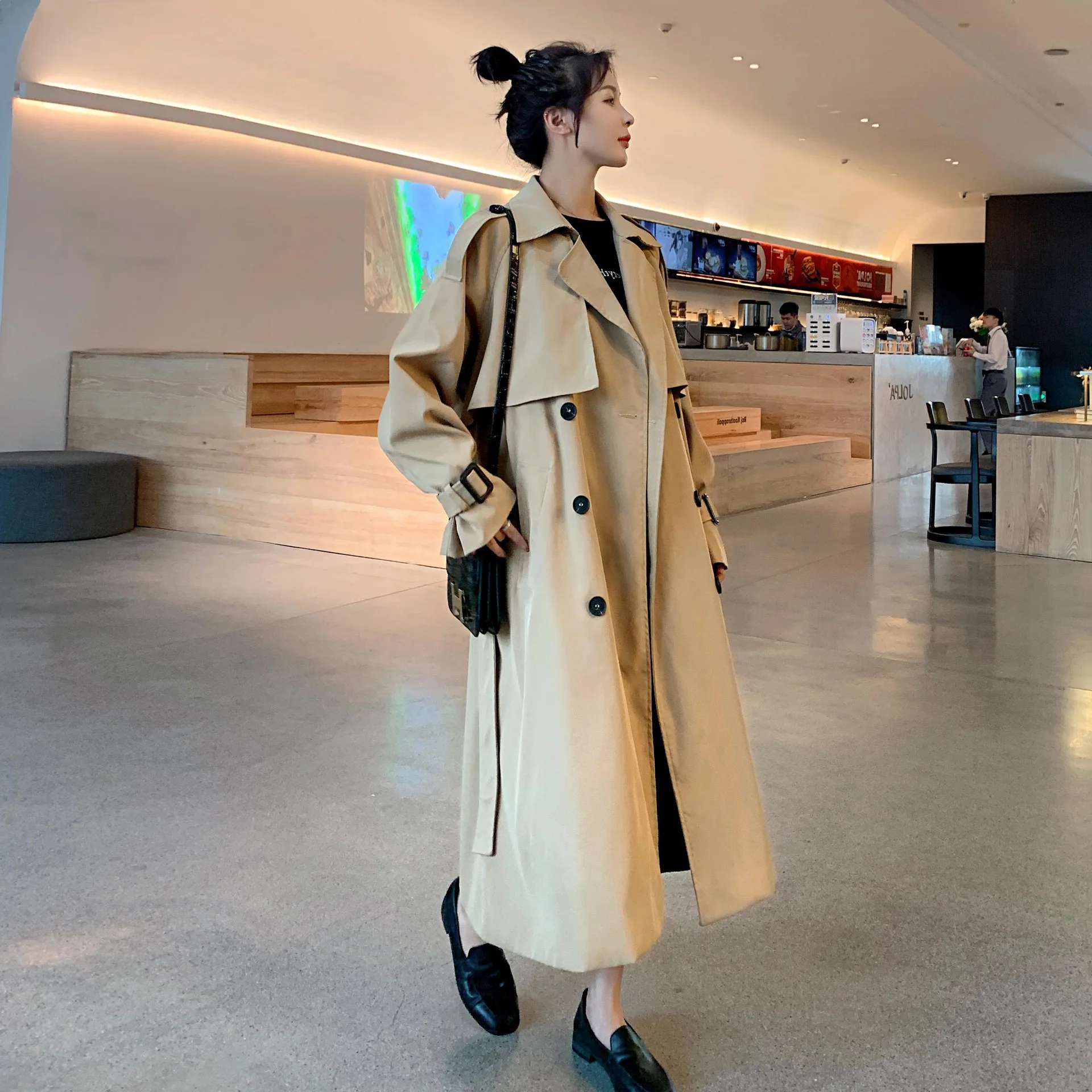 Женское длинное двубортное платье, Свободное пальто цвета хаки с поясом и штормовыми клапанами, верхняя одежда для весны и осени