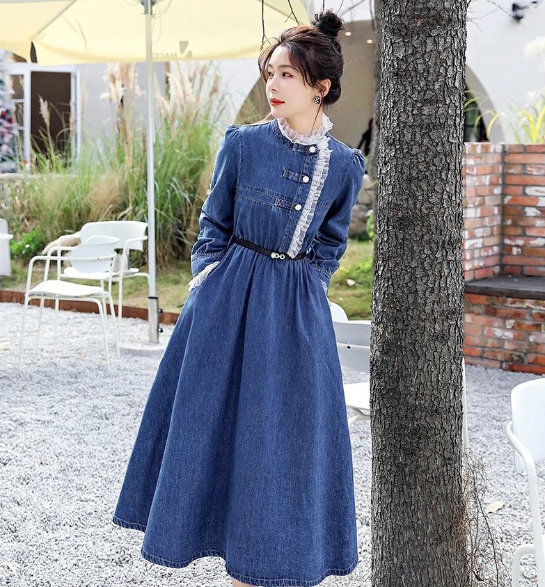 Женское длинное джинсовое платье, элегантное кружевное платье большого размера из денима, весна-осень