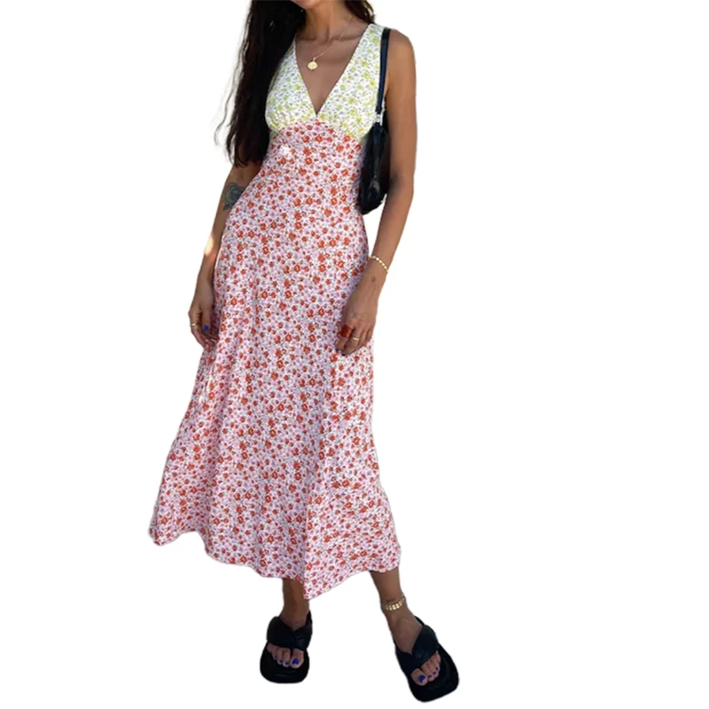 Женское длинное облегающее платье с цветочным принтом, V-образным вырезом и бретельками