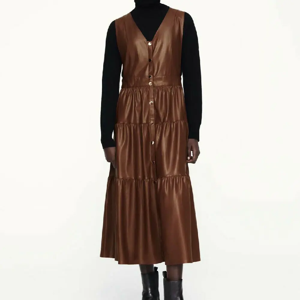 Женское длинное однобортное платье без рукавов из искусственной кожи