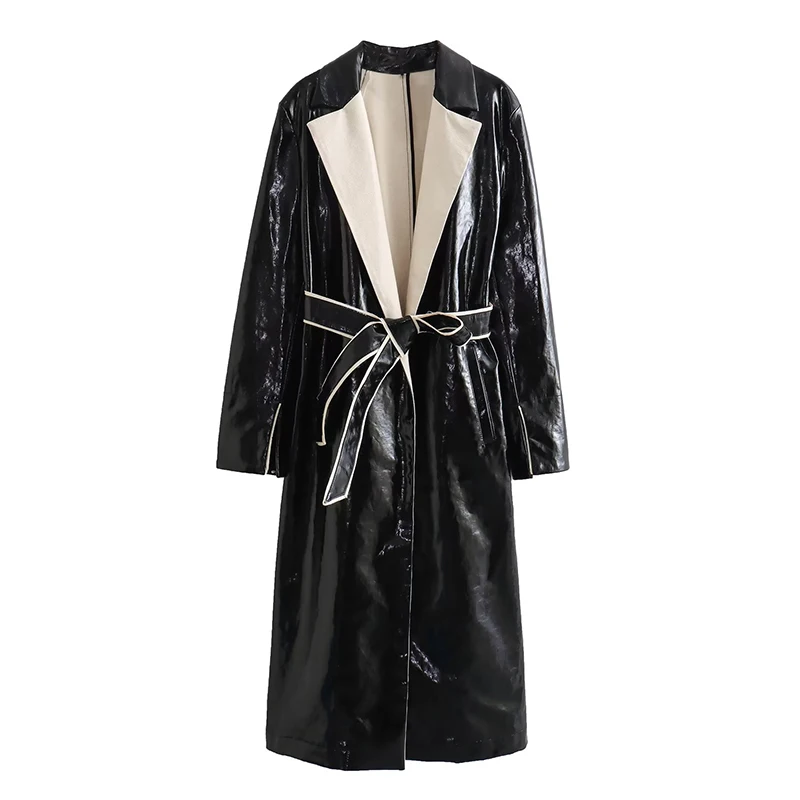 Женское длинное пальто из искусственной кожи, с поясом и длинным рукавом