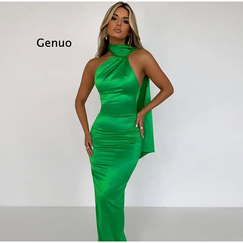 Женское длинное платье без рукавов, зеленое ажурное облегающее платье с лямкой на шее и разрезом, лето 2022
