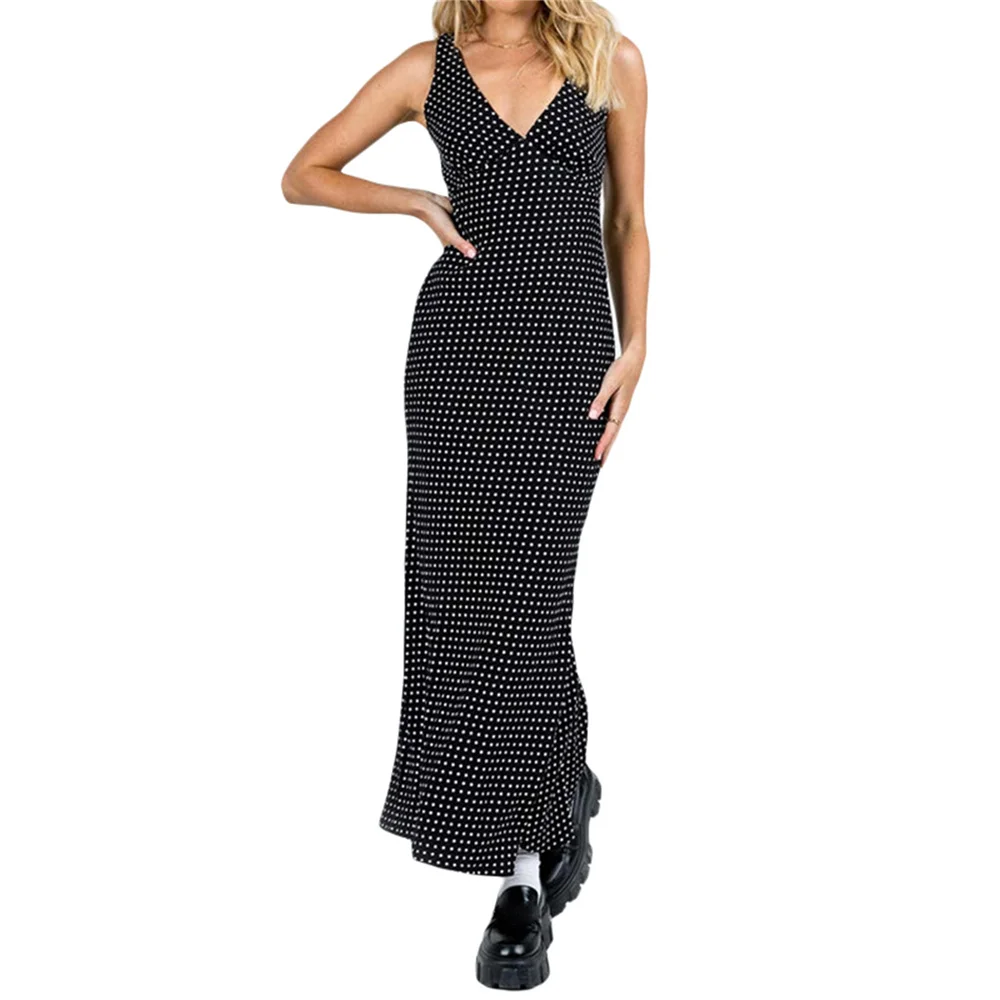 Женское длинное платье в горошек, с глубоким V-образным вырезом