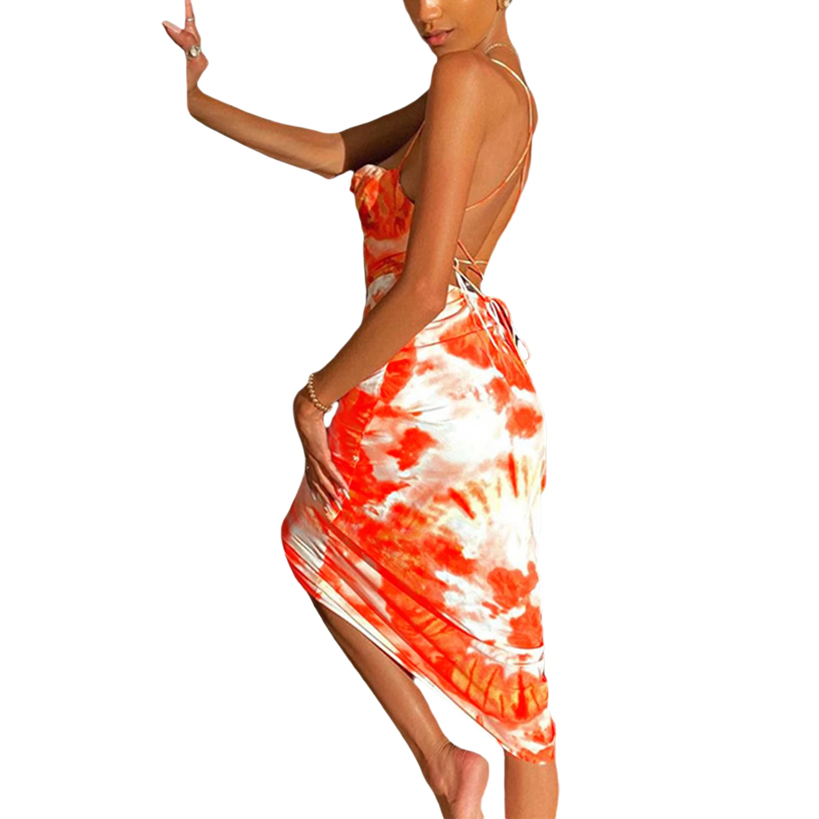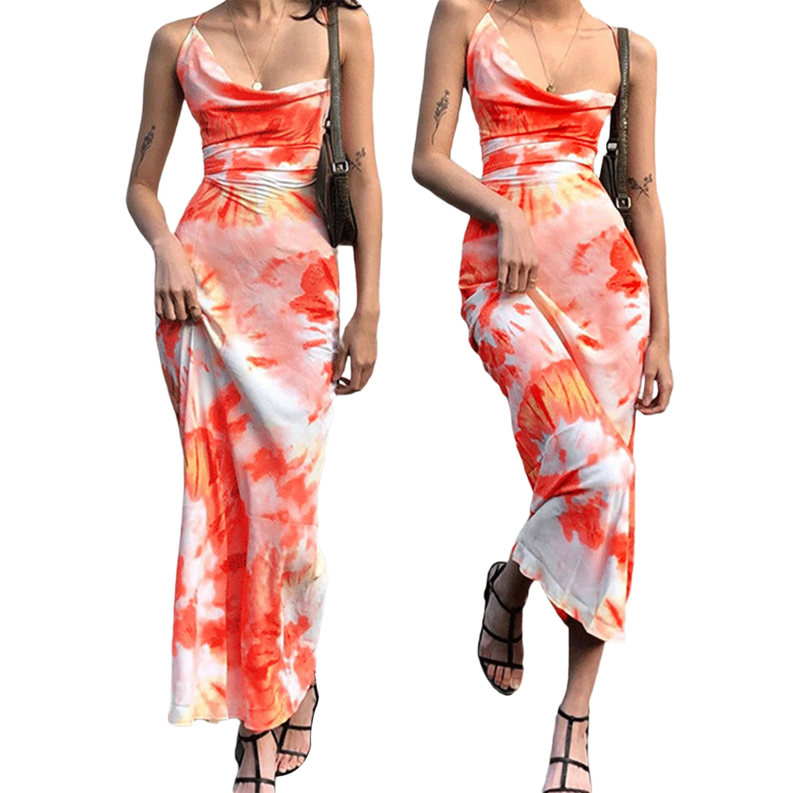 Женское длинное платье-комбинация, летнее оранжевое платье-комбинация с принтом, без рукавов, с вырезом лодочка