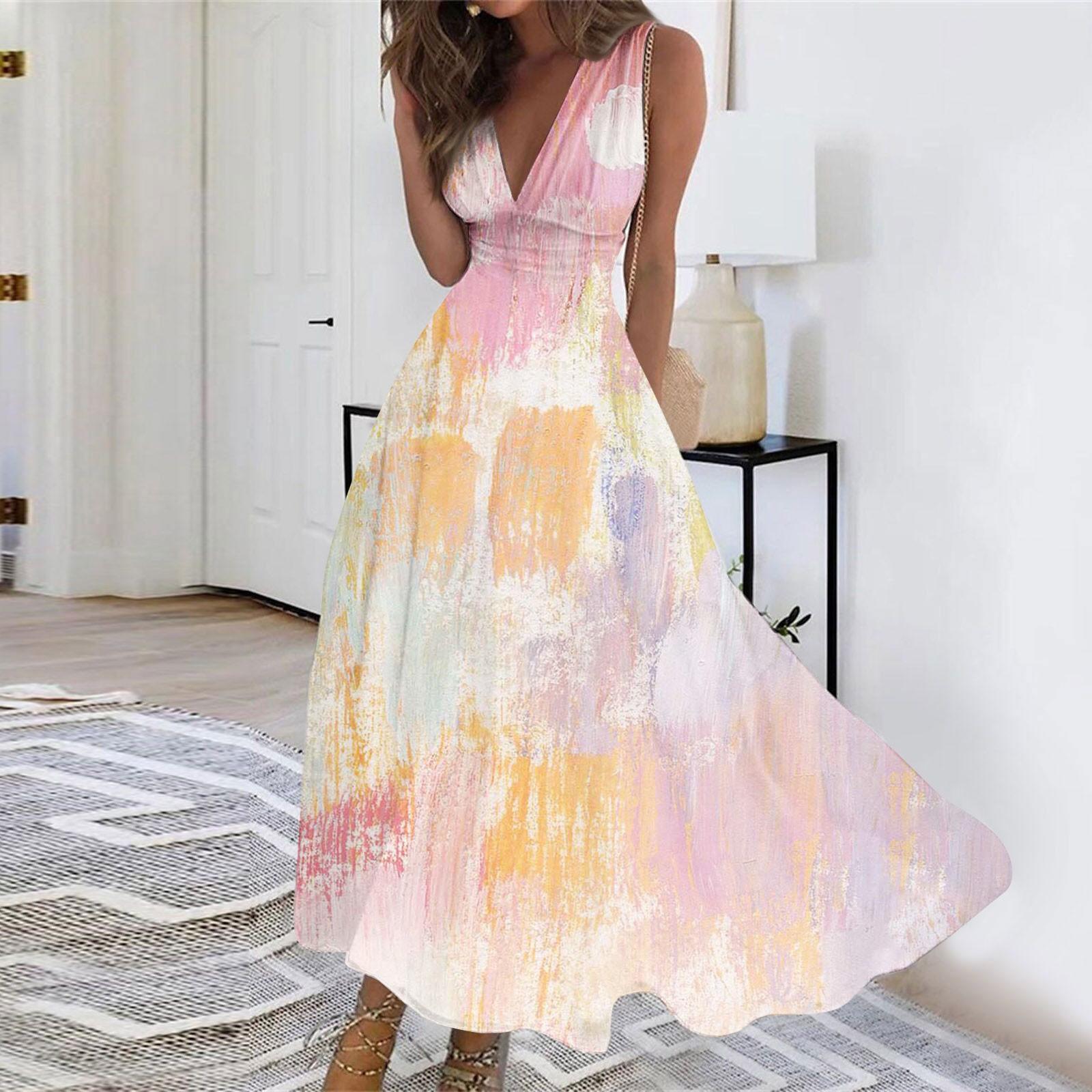 Женское длинное платье Платье макси Повседневное платье Летнее повседневное платье без рукавов с v-образным вырезом в стиле бохо с талией и принтом M хаки