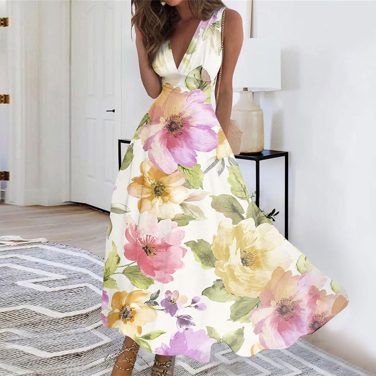 Женское длинное платье Платье макси Повседневное платье Летнее повседневное платье без рукавов с v-образным вырезом в стиле бохо с талией и принтом S жёлтый