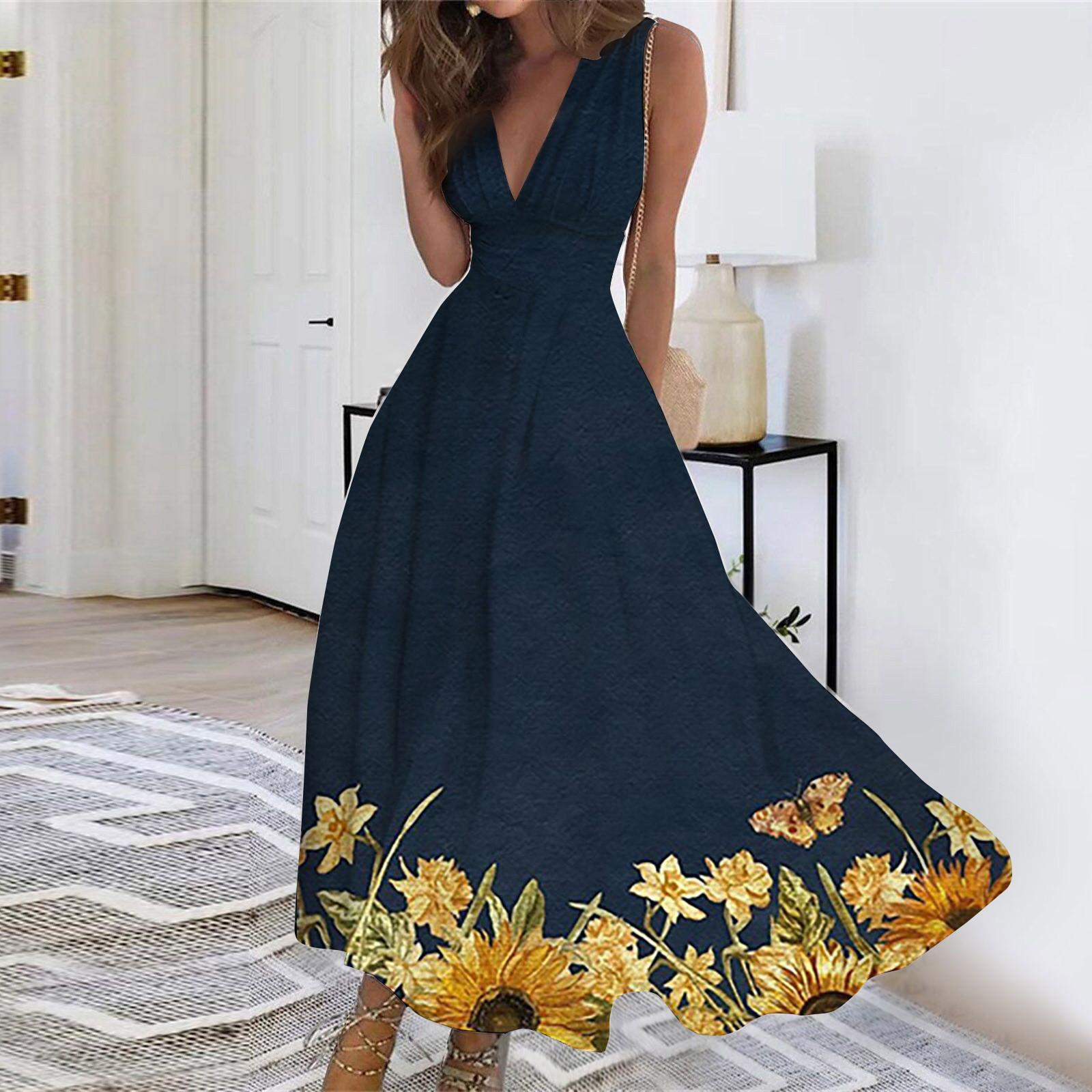 Женское длинное платье Платье макси Повседневное платье Свободное платье Платье трапециевидной формы с цветочным принтом Мода Уличная одежда На открытом воздухе Повседневные с принтом для свиданий Платье без рукавов с V-образным вырезом L тёмно-синий