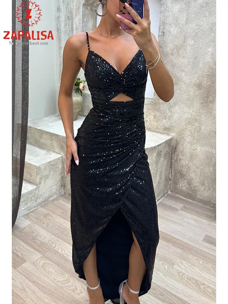 Женское длинное платье с блестками, открытой спиной и V-образным вырезом