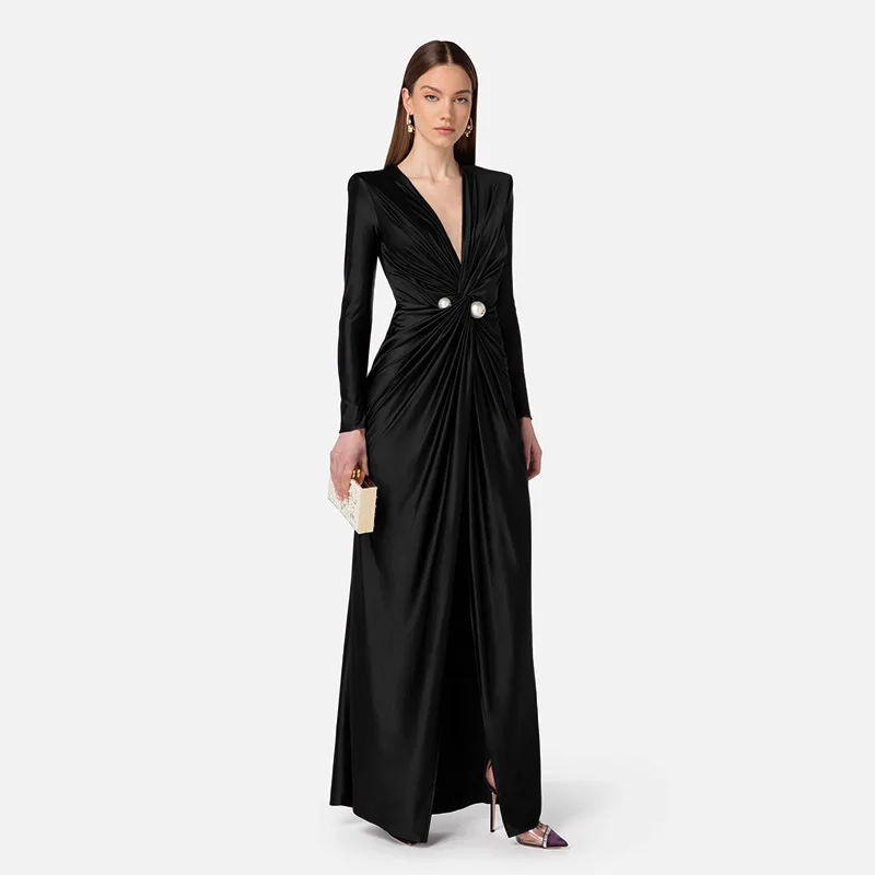 Женское длинное платье с глубоким V-образным вырезом и длинными рукавами