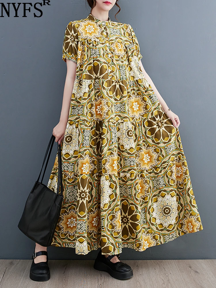 Женское длинное платье с коротким рукавом, свободное платье в Корейском стиле с принтом, лето 2023