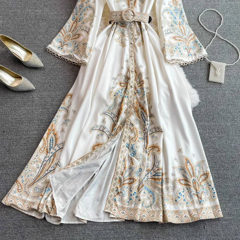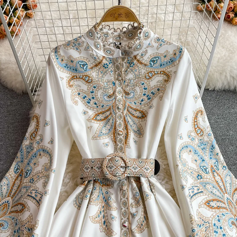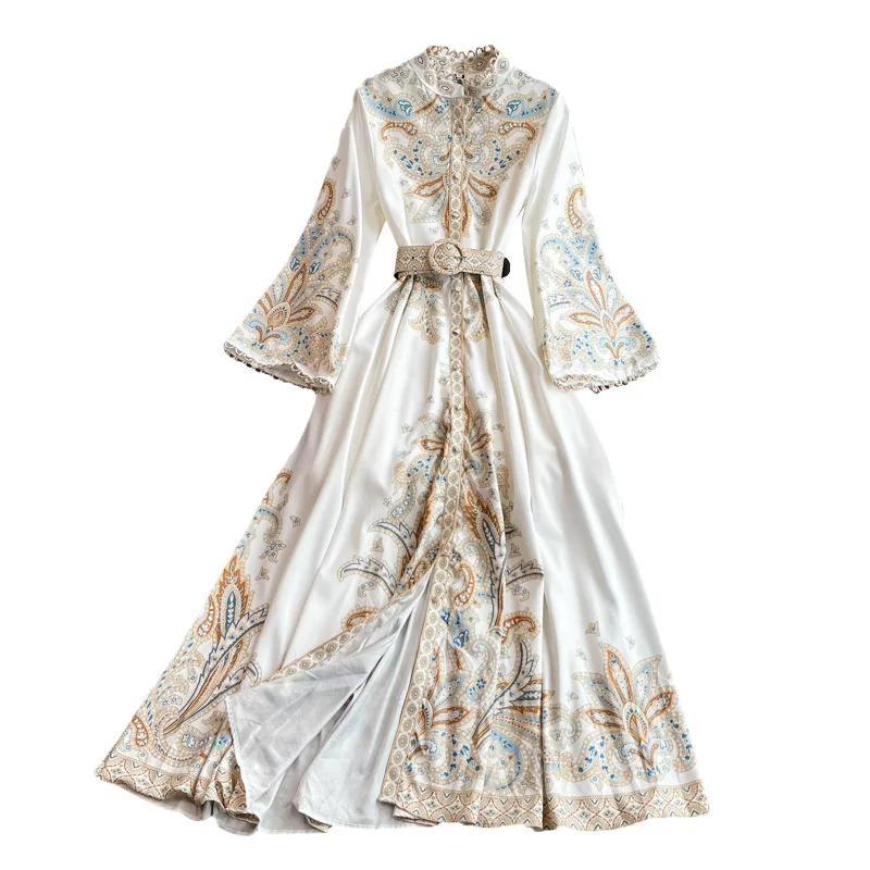 Женское длинное платье с поясом, однобортное белое платье с длинным рукавом и воротником-стойкой