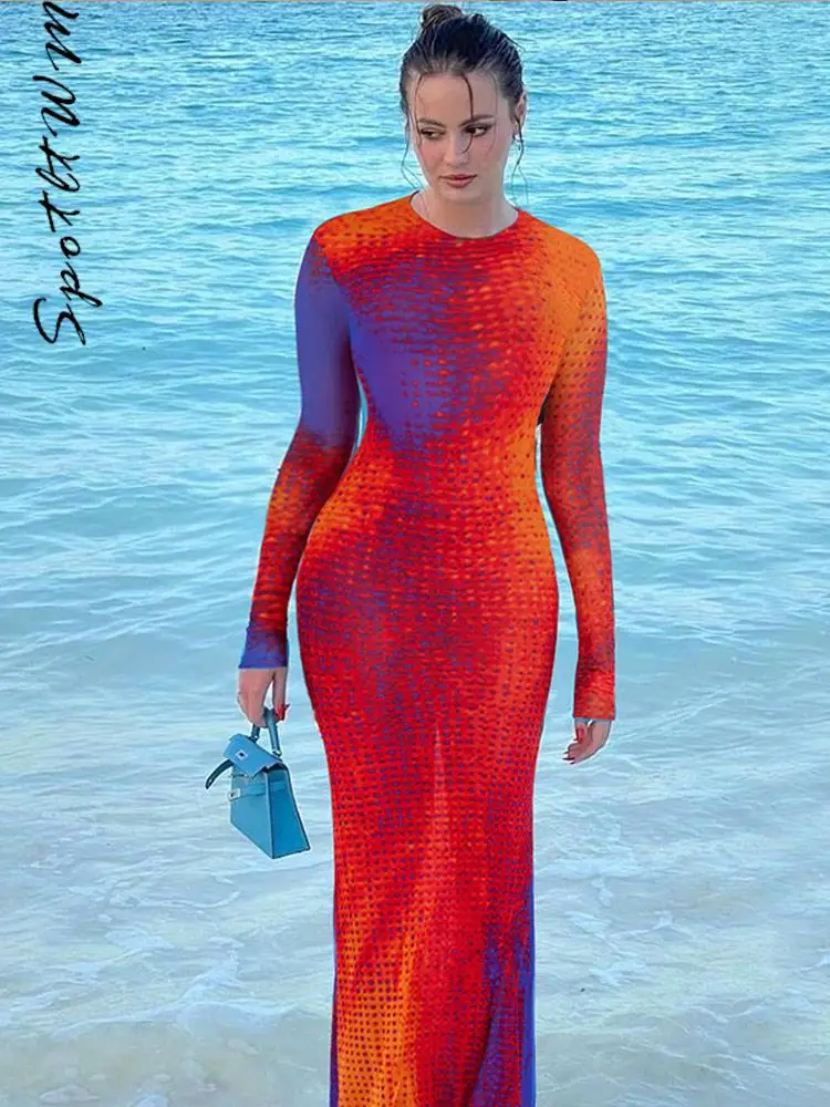 Женское длинное платье с принтом, пикантное облегающее платье с круглым вырезом, длинным рукавом и высокой талией, элегантное женское пляжное платье для отпуска