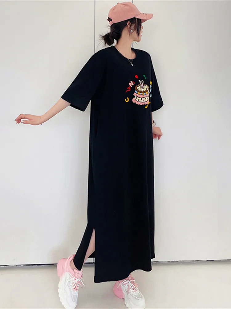 Женское длинное платье с разрезом, корейское платье-футболка с маленьким принтом торта и круглым вырезом, большие размеры, лето 2023