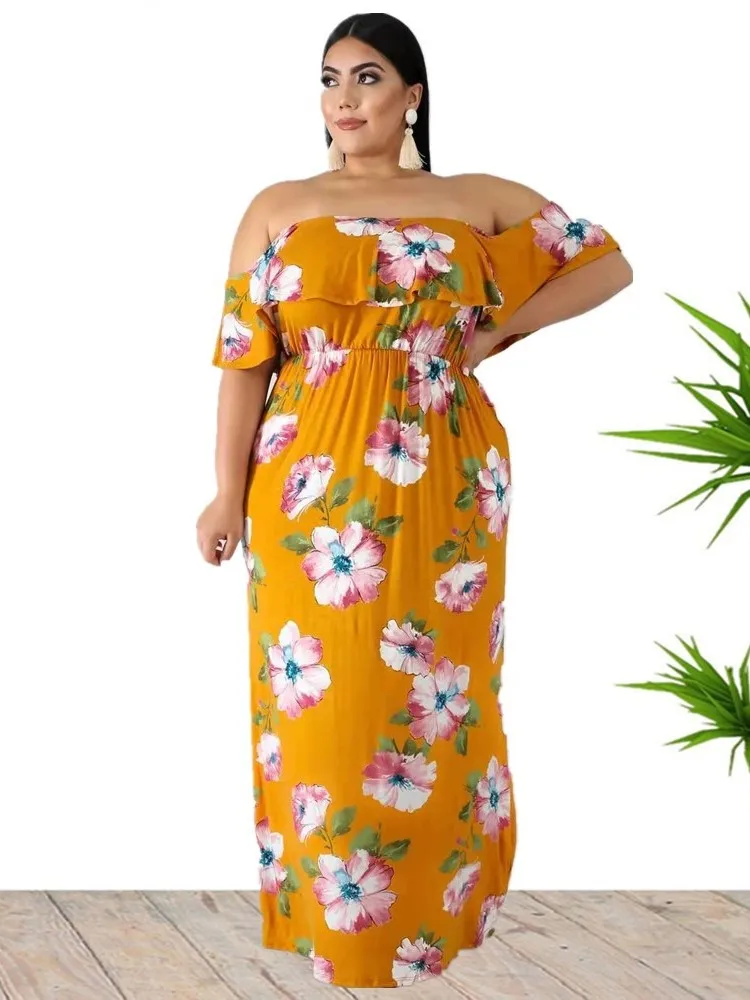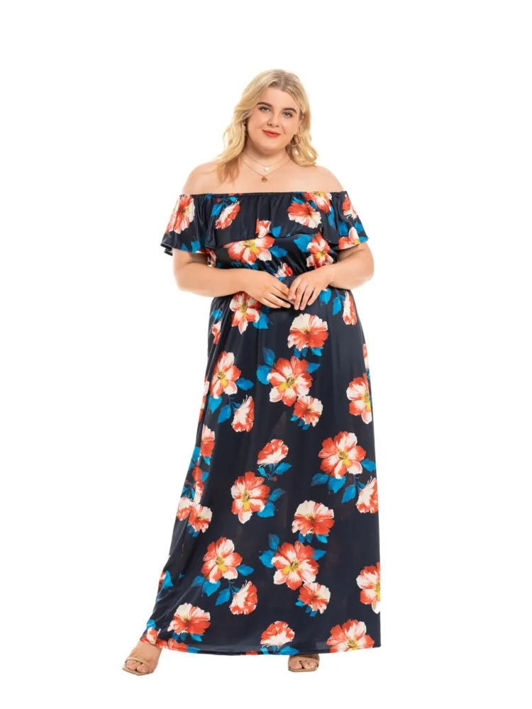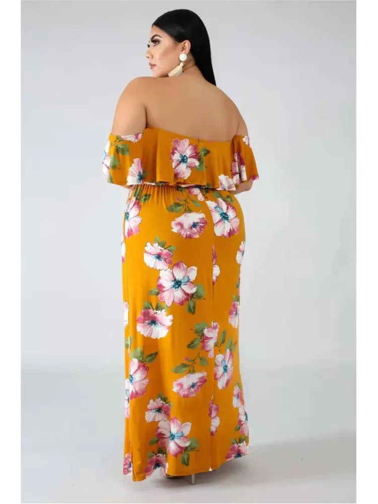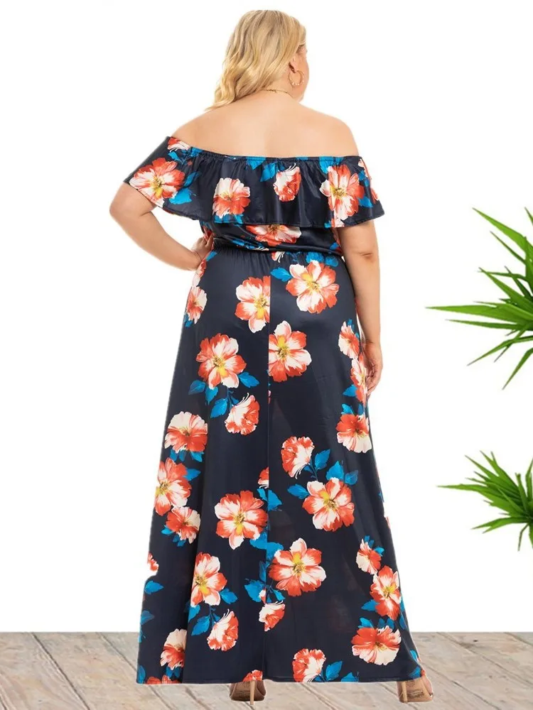Женское длинное платье с цветочным принтом, открытыми плечами