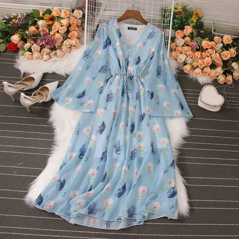 Женское длинное платье с цветочным принтом, повседневное пляжное платье с V-образным вырезом, расклешенным длинным рукавом и галстуком, женская одежда для весны и осени 2023