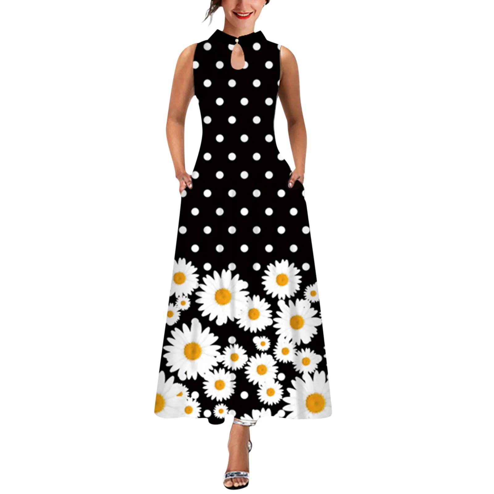 Женское длинное платье с цветочным принтом, свободное летнее пляжное платье макси в стиле бохо без рукавов с карманами