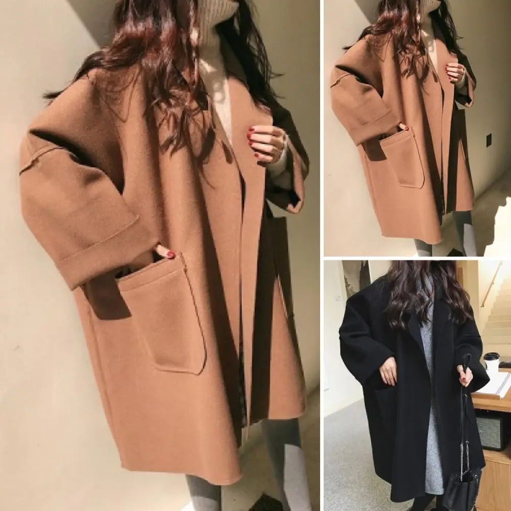 Женское длинное шерстяное пальто, винтажная куртка с V-образным вырезом и длинным рукавом, с карманами, Осень-зима 2023