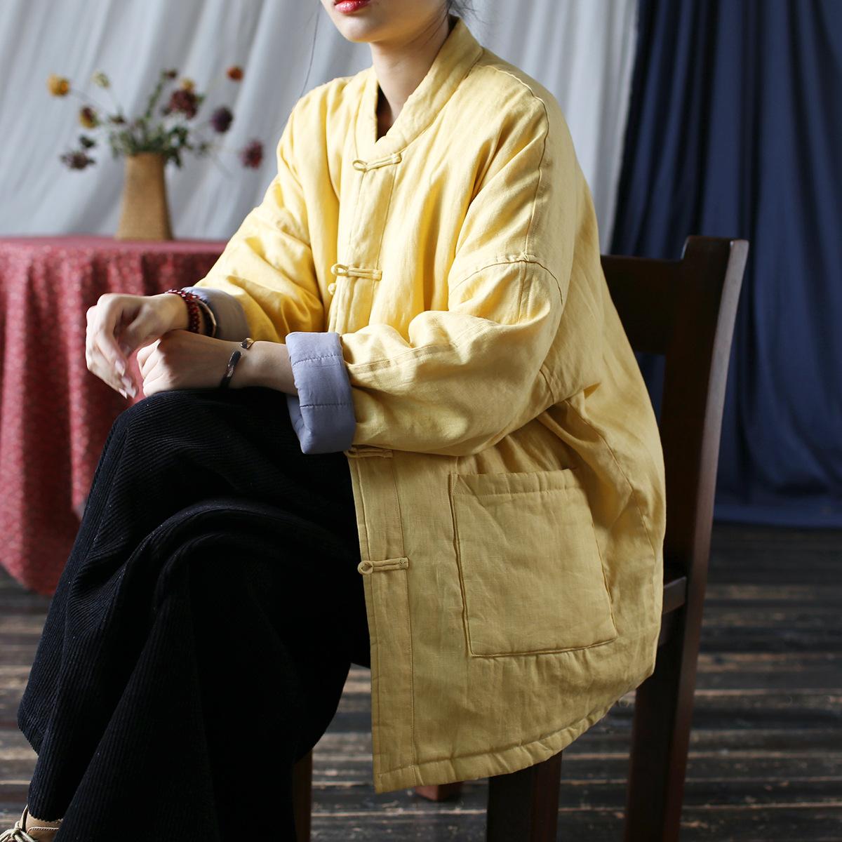 Женское зимнее пальто в китайском стиле с пряжкой, однотонное, винтажное, ретро, с длинными рукавами, однобортное пальто One Size жёлтый