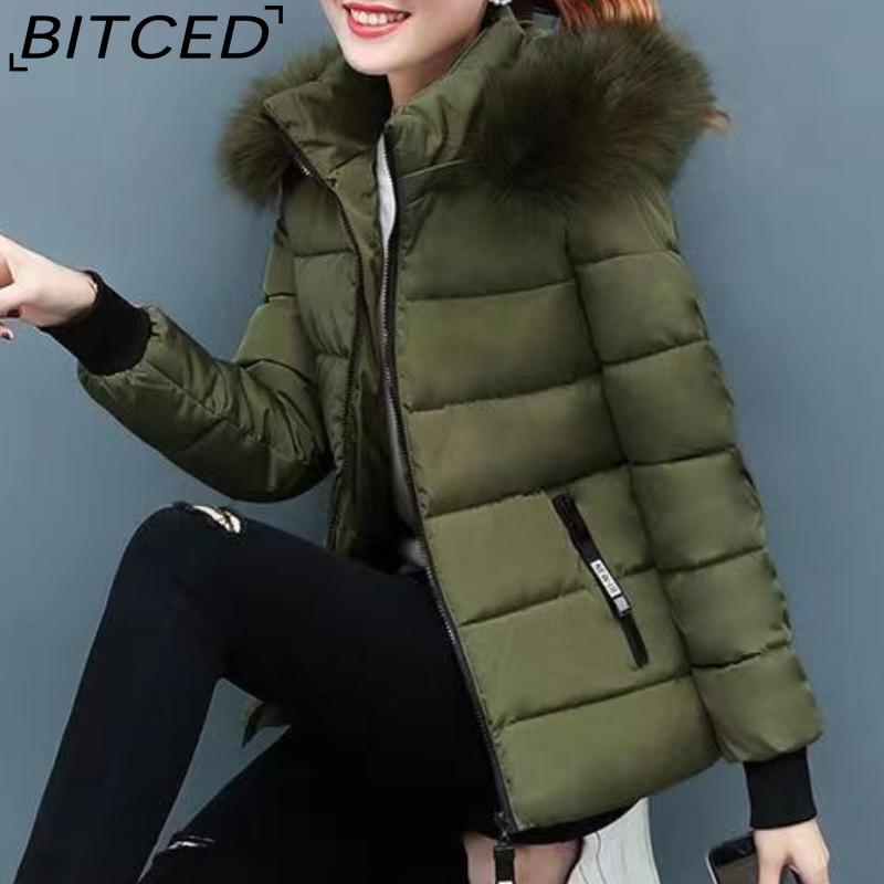 Женское зимнее пальто BITCED короткой длины: Приталенная стеганая хлопковая куртка с большим меховым воротником XXXXL армия зеленый