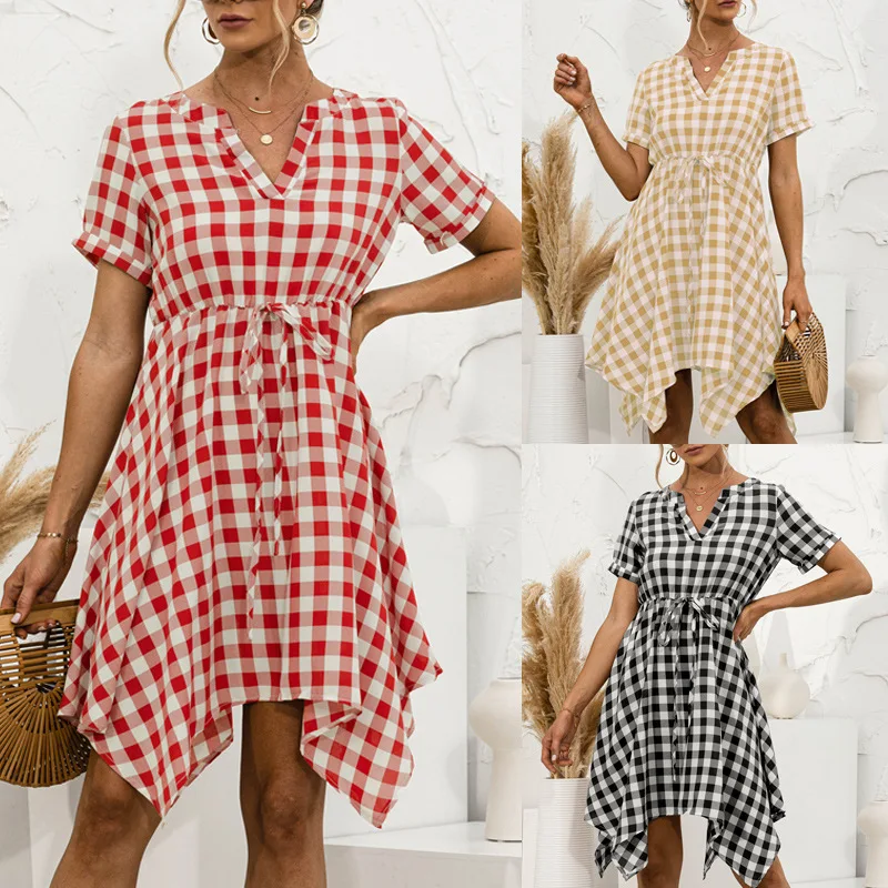 Женское клетчатое мини-платье А-силуэта с коротким рукавом и V-образным вырезом