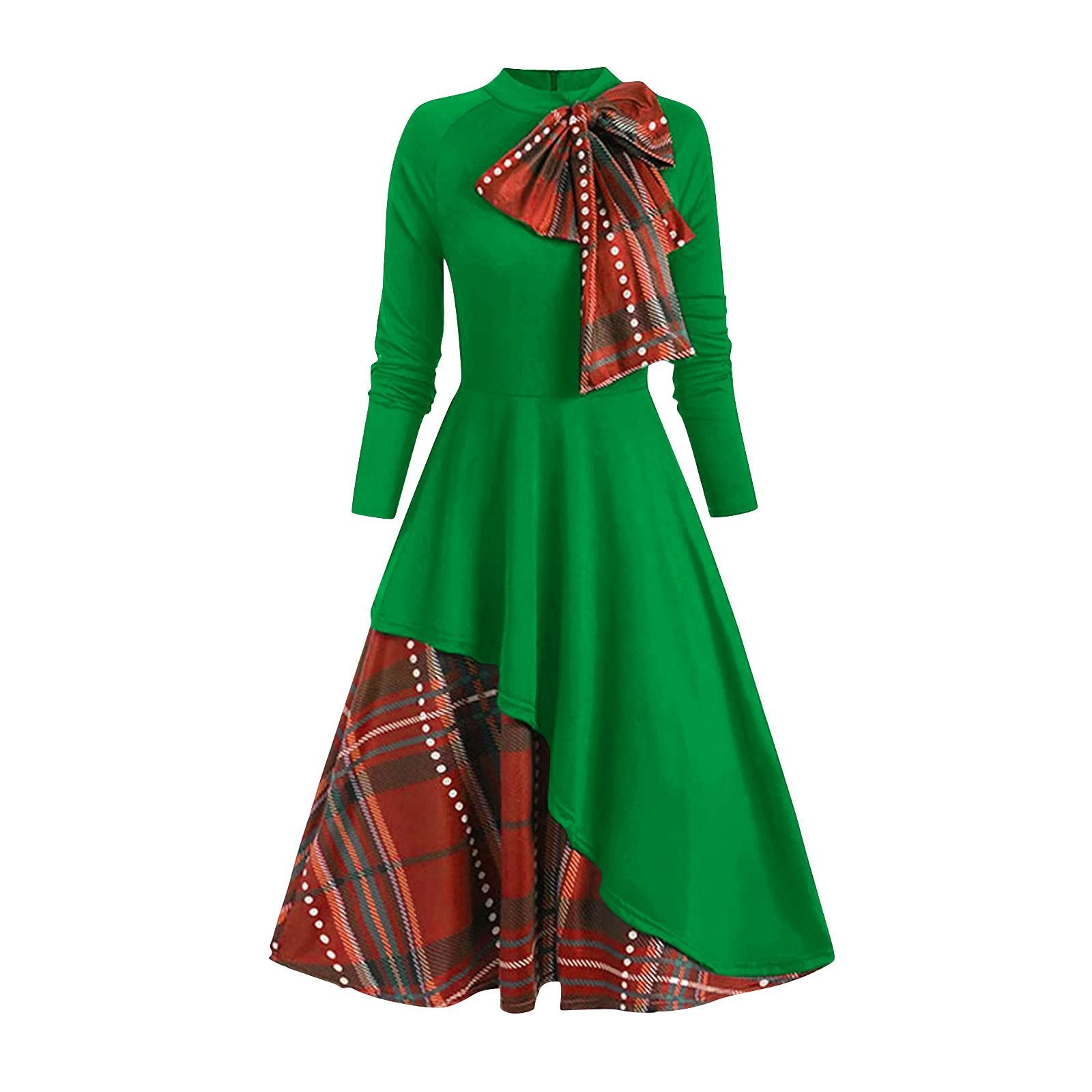 Женское клетчатое платье с бантом и принтом в стиле пэчворк с длинным рукавом и круглым вырезом на пуговицах L зелёный