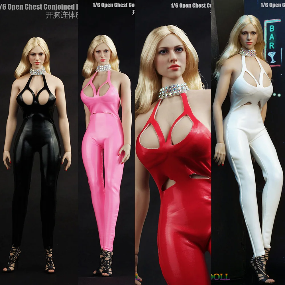 Женское кожаное боди с высоким воротником, открытой грудью и открытой спиной, в масштабе 1/6