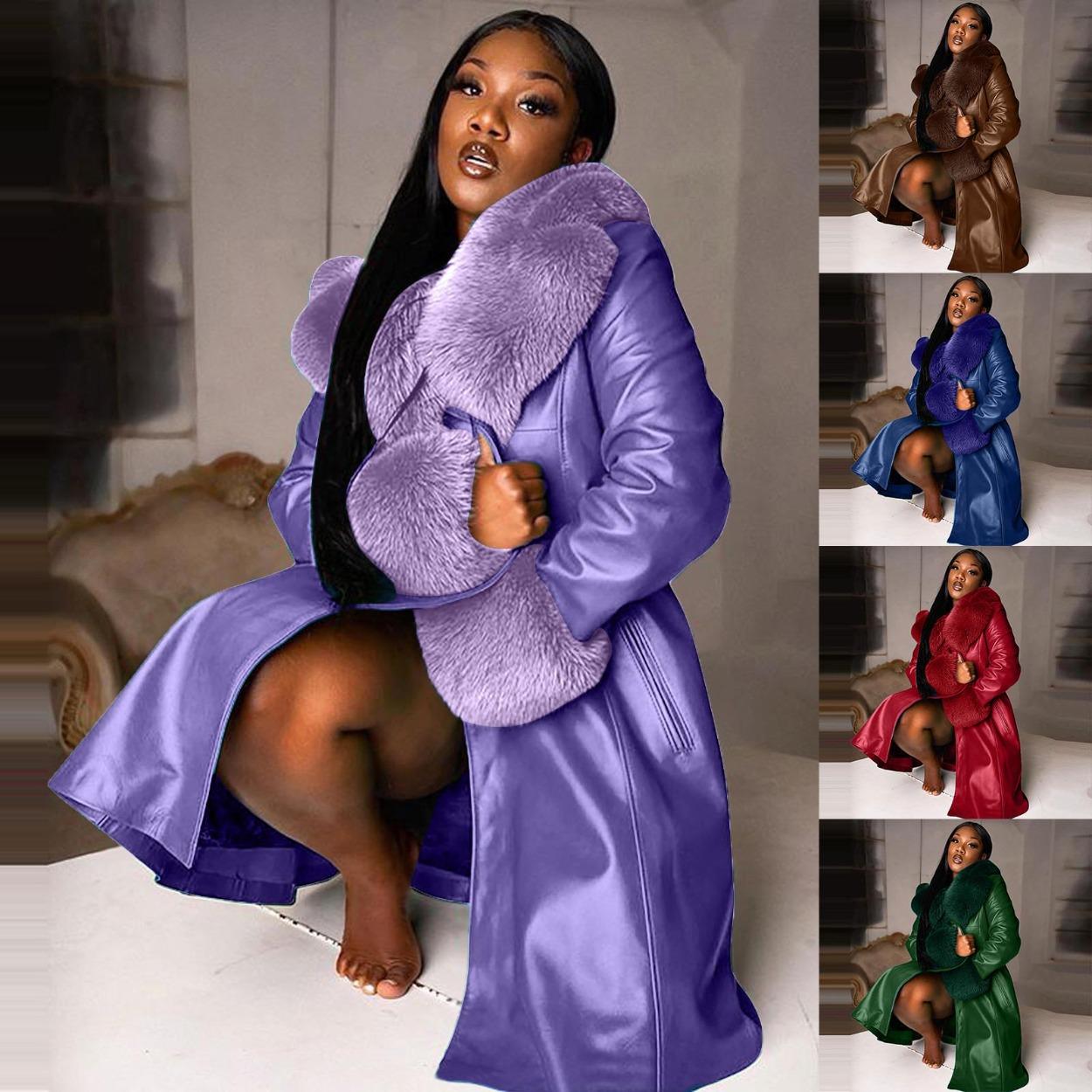 Женское кожаное пальто с воротником, зимняя мода, лацкан с длинным рукавом на молнии, повседневные куртки больших размеров, пальто