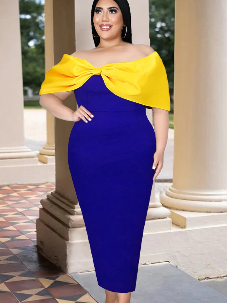 Женское коктейльное платье, синее длинное облегающее платье с открытыми плечами и бантом, модель 2022 большого размера 4XL