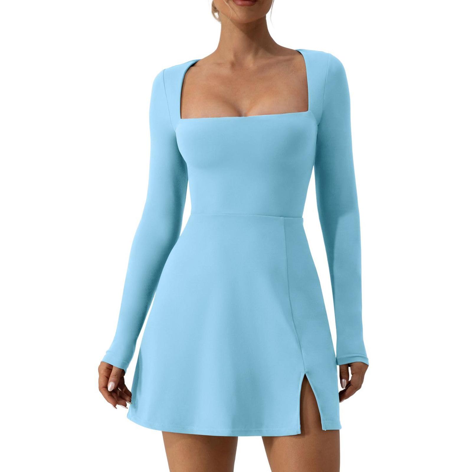 Женское короткое платье весна-лето, однотонное, с длинным рукавом, квадратным вырезом, разрезом по низу, вечернее платье XL синий