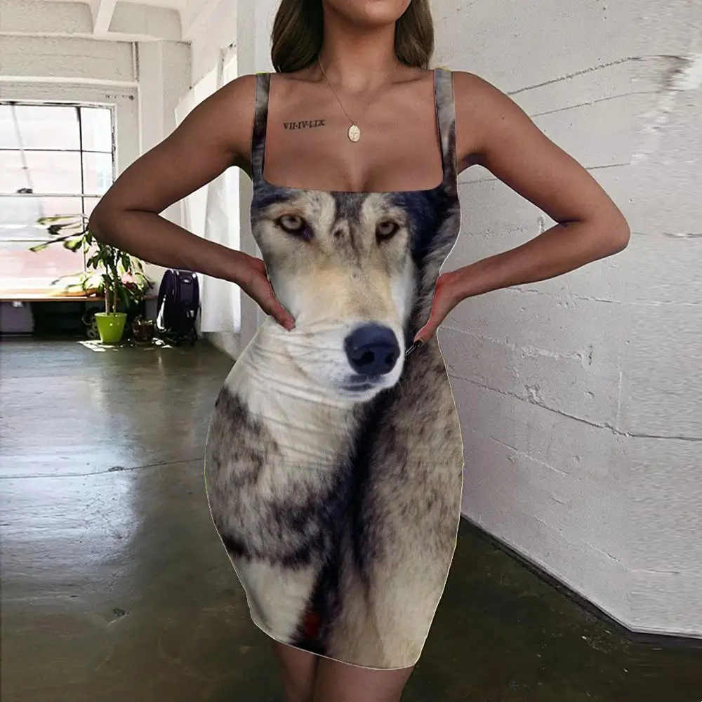 Женское короткое пляжное платье KYKU, летнее платье с объемным принтом волка и лямкой на шее, лето