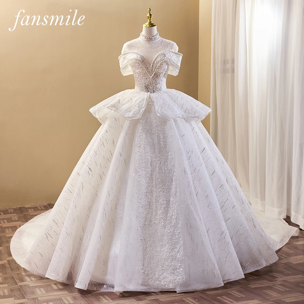 Женское кружевное бальное платье Fansmile, роскошное свадебное платье со шлейфом и вырезом лодочкой, модель 2023