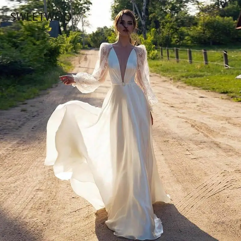 Женское кружевное платье, белое длинное ажурное платье с V-образным вырезом и рукавами-фонариками, длинная юбка, весна-осень