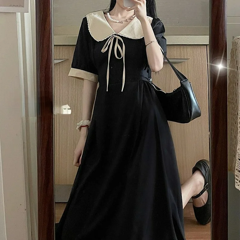 Женское кружевное платье в стиле пэчворк, черное облегающее платье с коротким рукавом и воротником «Питер Пэн», элегантное винтажное платье на лето
