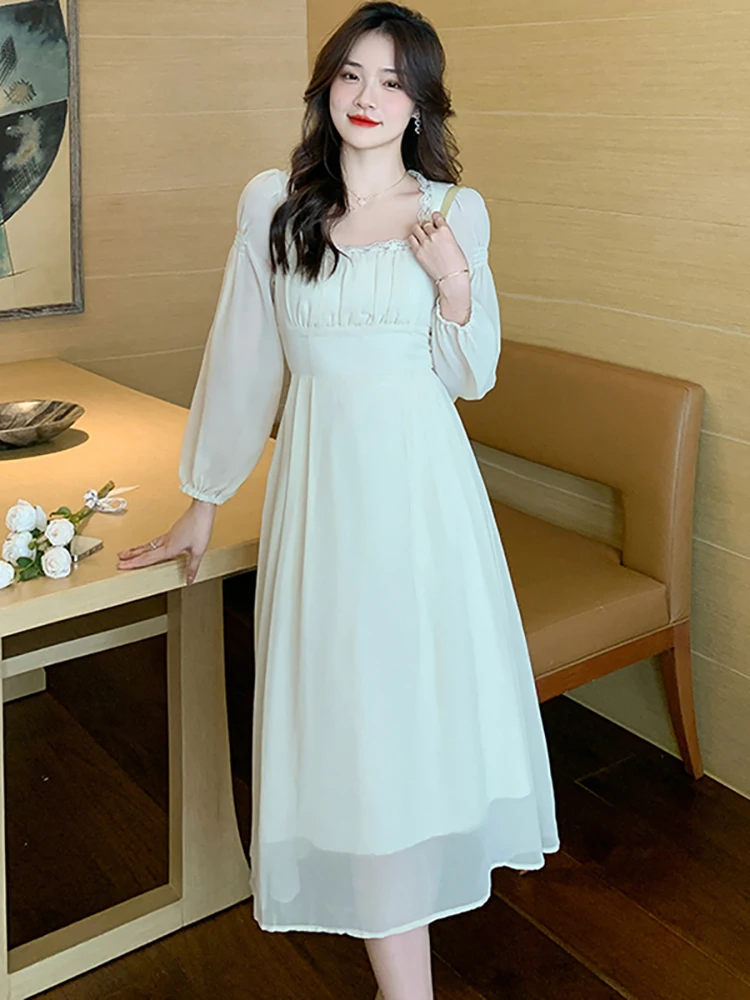 Женское кружевное платье миди, белое элегантное облегающее платье с длинным рукавом и квадратным вырезом в Корейском стиле, весна 2023