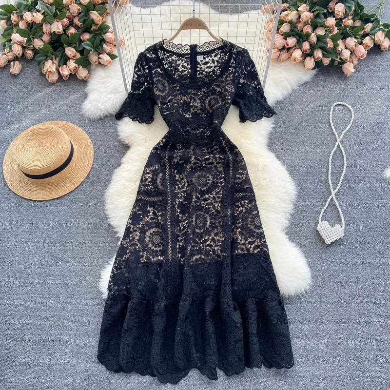 Женское кружевное платье-миди с круглым вырезом и коротким рукавом