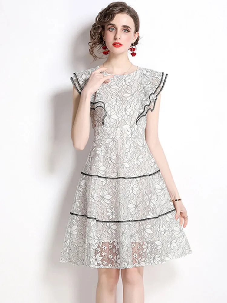 Женское кружевное платье с оборками, дизайнерское белое элегантное ТРАПЕЦИЕВИДНОЕ вечерние-платье без рукавов с круглым вырезом, лето 2022