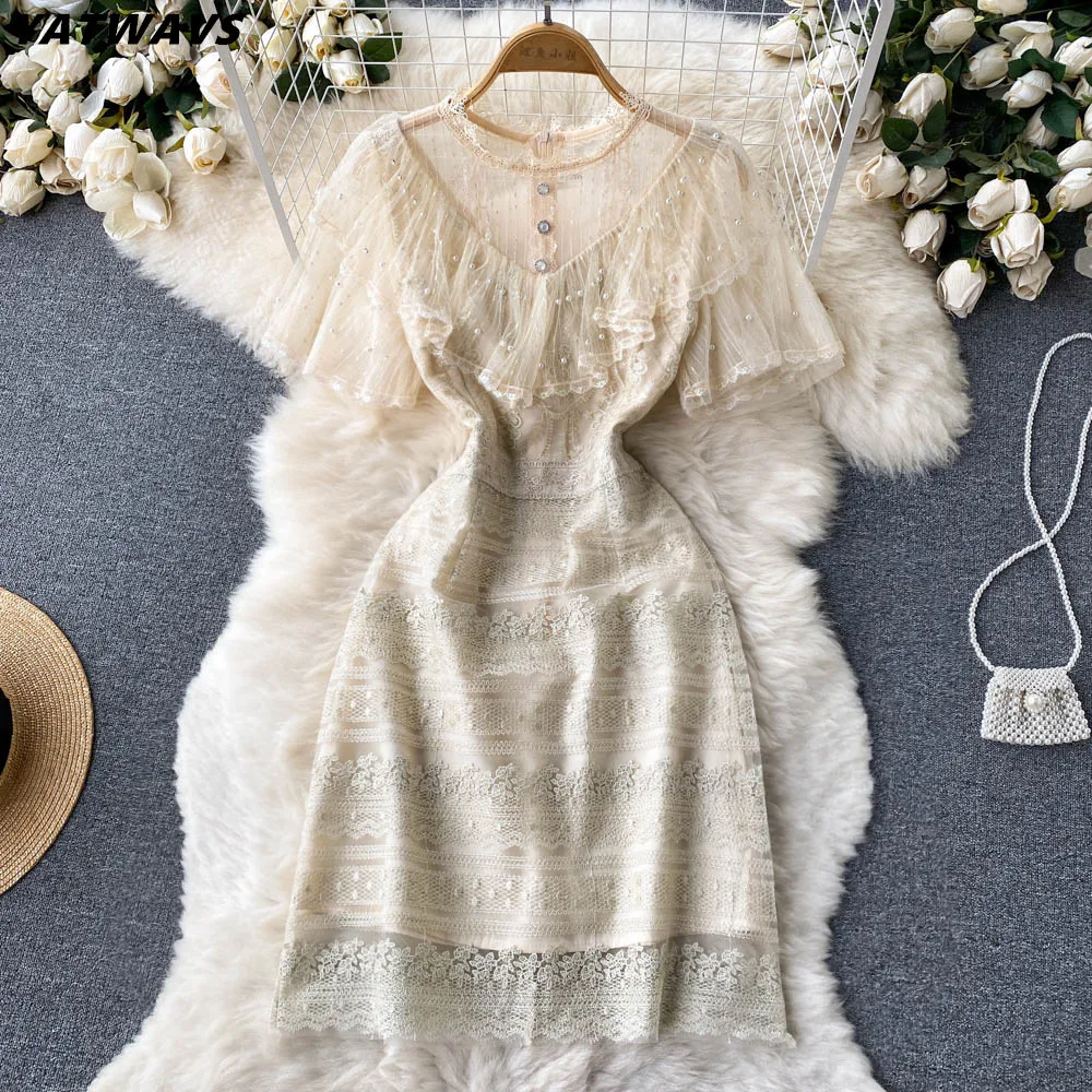 Женское кружевное платье с оборками, подиумное Элегантное повседневное Сетчатое платье-трапеция с короткими рукавами и вышивкой бисером, л...