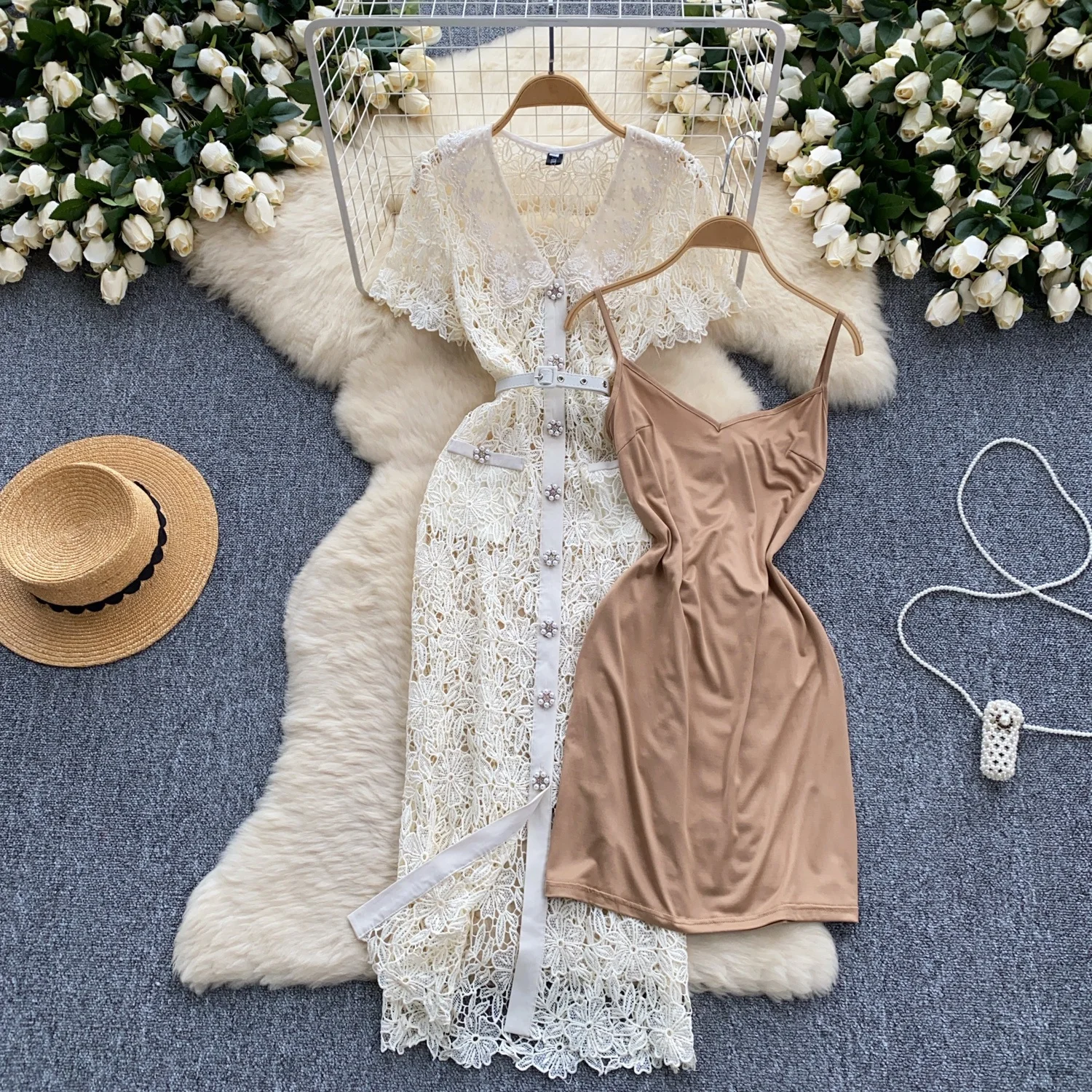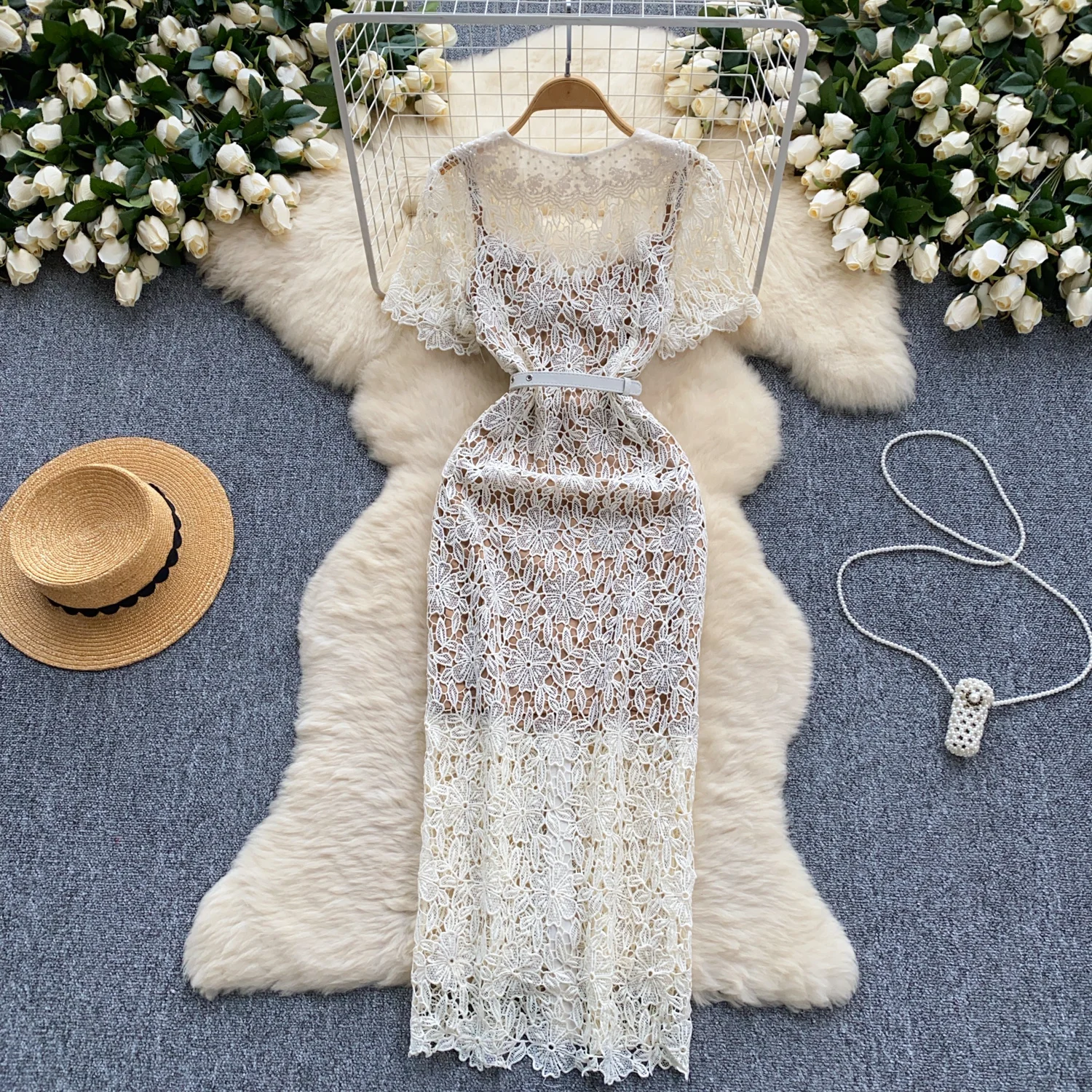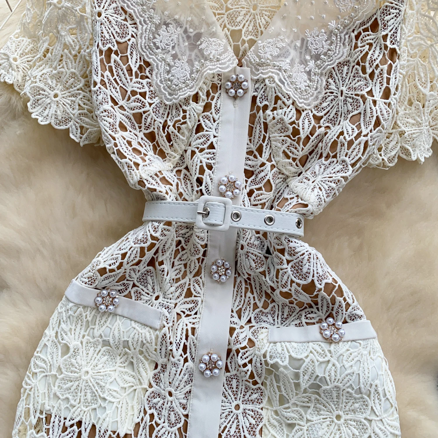 Женское кружевное платье с поясом, коротким рукавом и отложным воротником