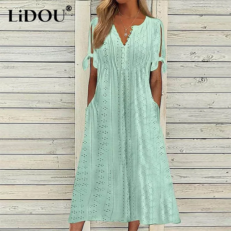 Женское кружевное платье с V-образным вырезом, коротким рукавом и карманами