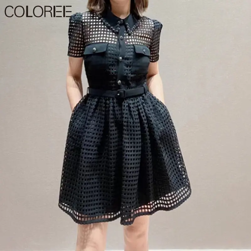 Женское кружевное платье, черное ажурное платье с коротким рукавом, винтажное модельное дизайнерское платье с бисером, лето 2023
