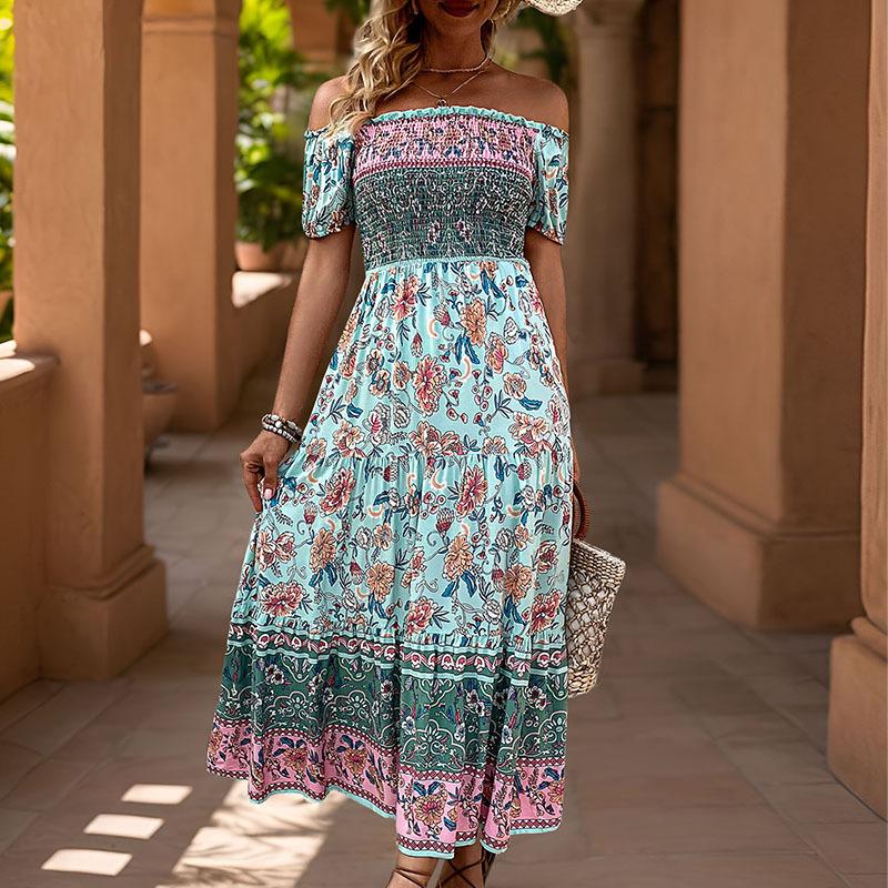 Женское летнее винтажное этническое отпускное платье с принтом и открытыми плечами XL зелёный